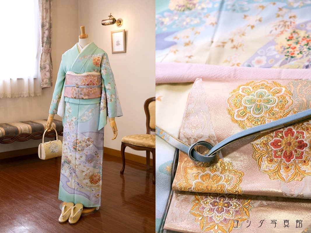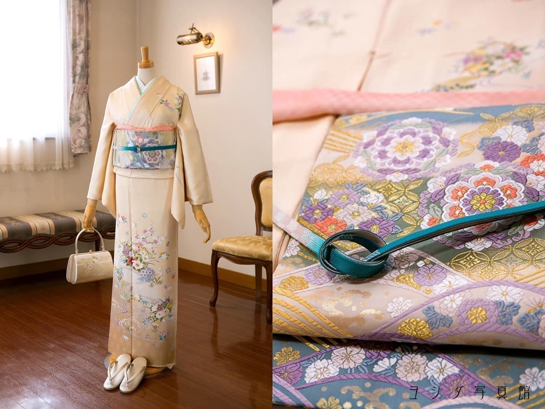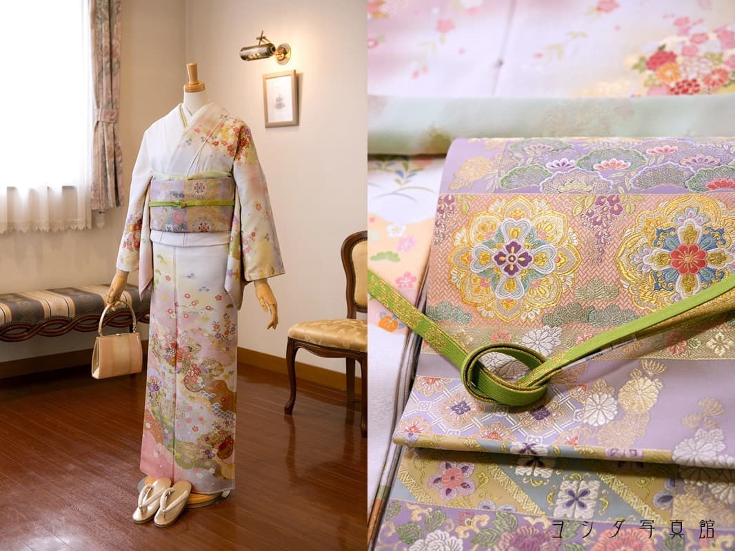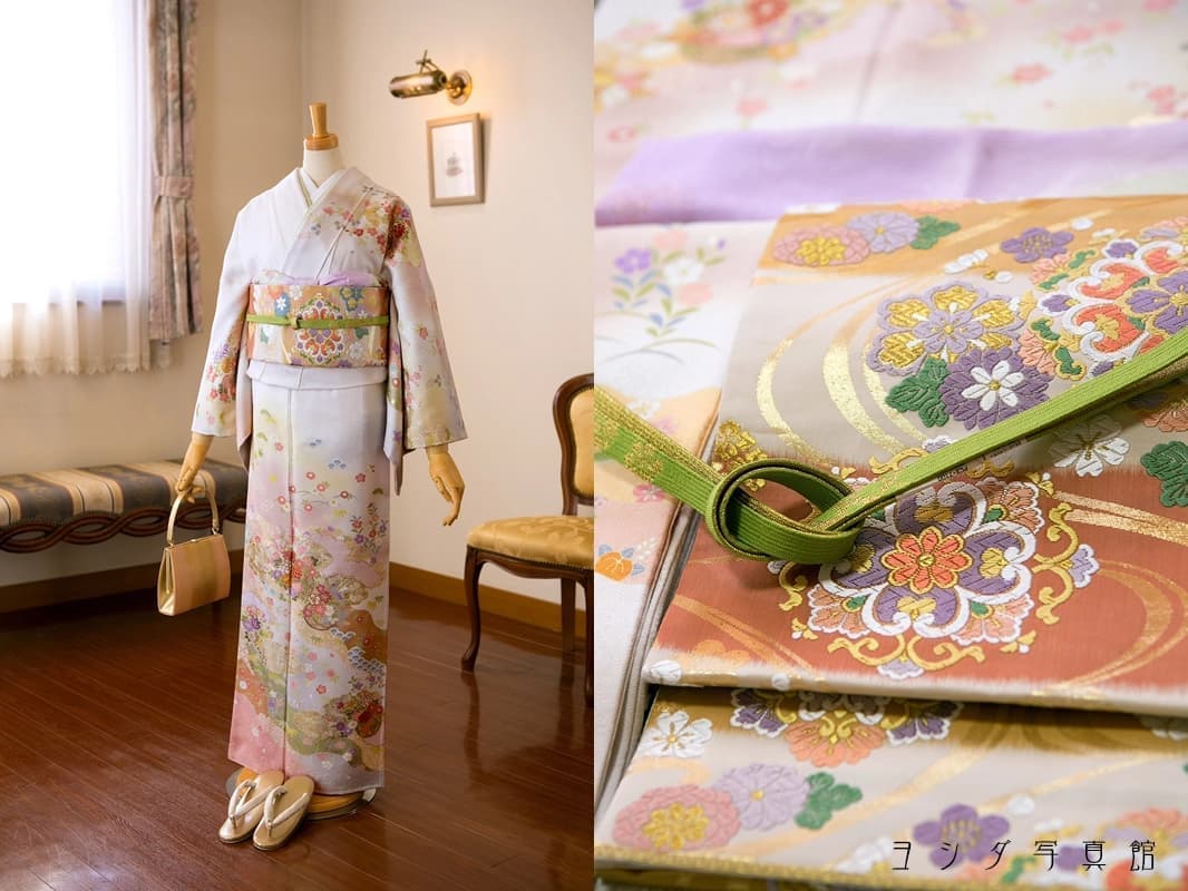 訪問着、袋帯、草履、バッグ、帯揚げ、帯締め、長襦袢、重ね衿、肌着、足袋、着付け用小物道具一式、ヘア飾り