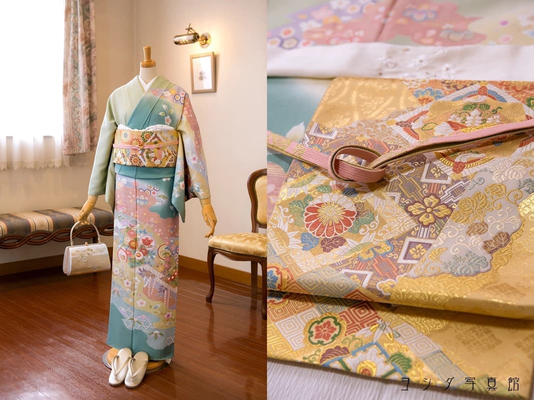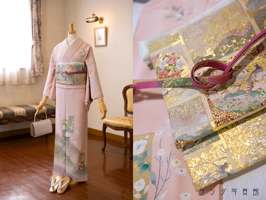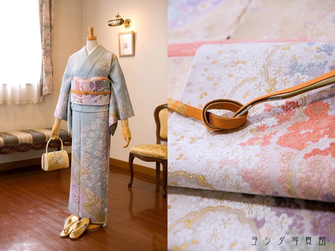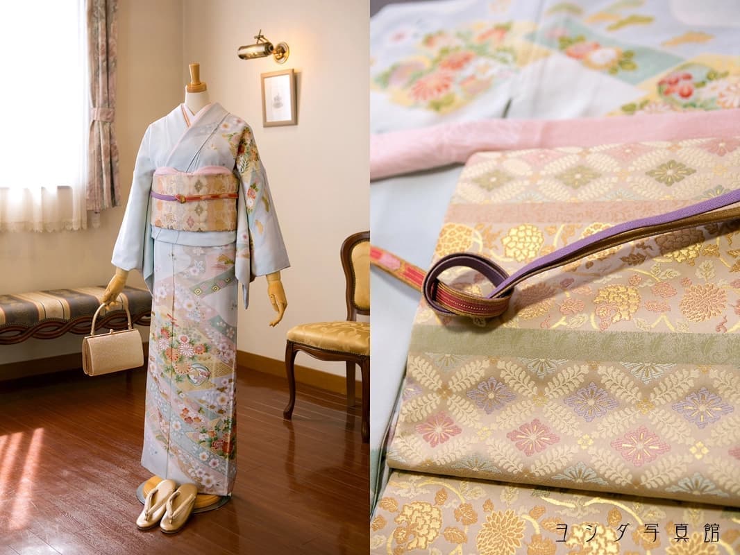 訪問着、袋帯、草履、バッグ、帯揚げ、帯締め、長襦袢、重ね衿、肌着、足袋、着付け用小物道具一式、ヘア飾り